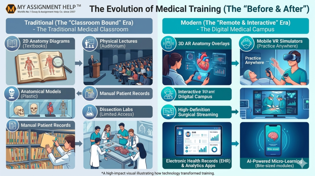 [Image showing the contrast between traditional medical training methods (anatomical models, dissection labs, physical textbooks) and modern, digital-first training tools (VR anatomy, surgical simulators, streaming lectures, mobile apps, remote patient monitoring systems).]