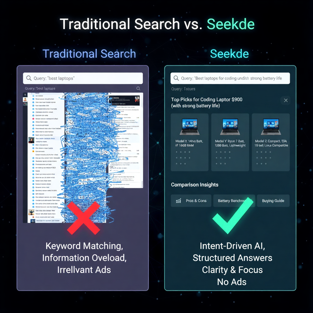 Most search tools match keywords and throw endless links your way. Seekde does something smarter,it reads your intent.
