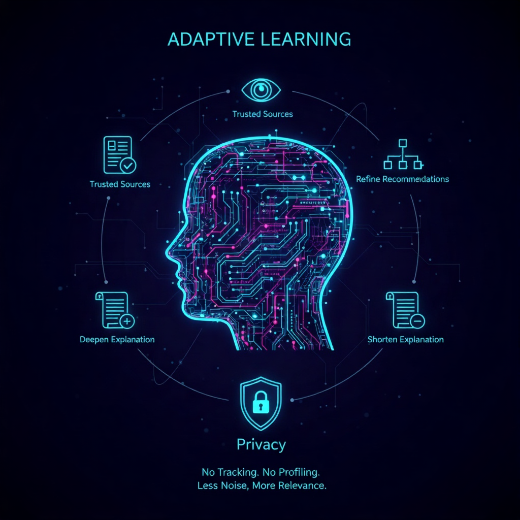 It learns from your interactions—what you open, save, or skip—and refines its recommendations.